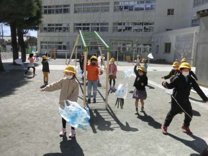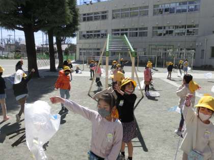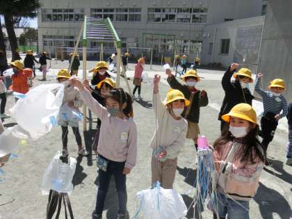 昨日、今日と風が強かったですが、1年生は風を生かした学習をしました。ビニール袋で凧のようなものをつくり、校庭で飛ばしていました。今日は絶好の学習日和でした。