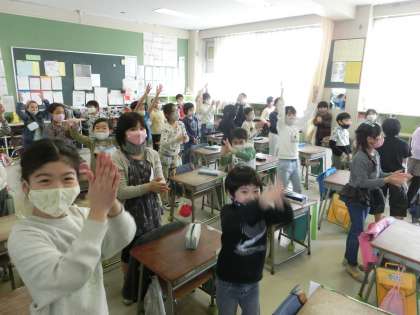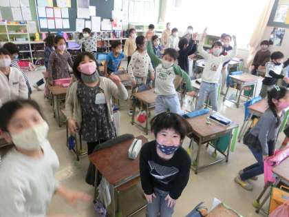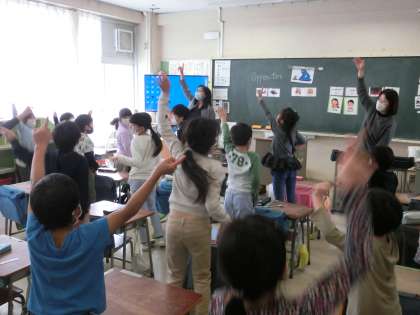 ALTの先生と英語専科の先生による外国語活動の様子です。歌やジェスチャーなどに取り組み、みんな生き生きと学習していました。楽しさが写真から伝わると思います。