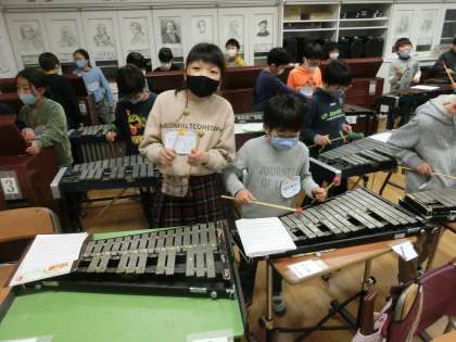 4年生の合奏では「ジッパディードゥーダー」に取り組みました。キーボードや木琴、鉄琴、リコーダーなど、自分の楽器を熱心に練習しました。どのような演奏になるか楽しみです。この1年、4年生はいろいろな合奏に挑戦してきました。このような学習の積み重ねが5年生、6年生の音楽に生かされます。