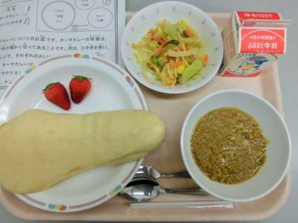 今日は、ナン、牛乳、キーマカレー、じゃがいものパリパリサラダ、いちごです。