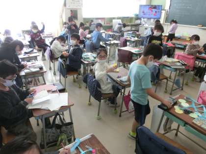 2年生の生活科では「ありがとうをつたえよう」という単元を行っています。日頃お世話になっている人に感謝の気持ちを込めた作品をつくっています。色紙を使った花、メダル、感謝状などを感謝の気持ちを込めて作っていました。