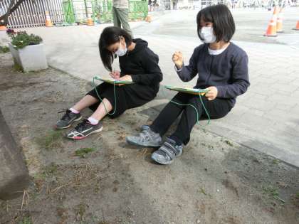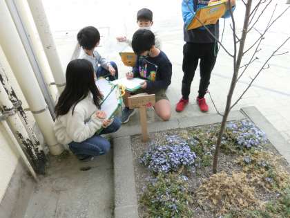 4年生の図工では「木々を見つめて」という学習をしています。校庭や近くの公園などの木を選んで描いていました。見た目や、色、形、香りなどに着目して学習に取り組んでいました。集中して描いていました。4月からは5年生、さすがです!