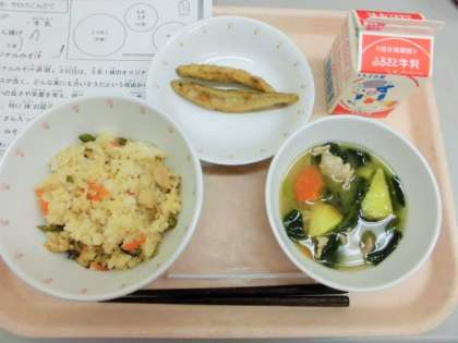 今日は、とりめし、牛乳、わかさぎのからあげ、5年1組オリジナルみそ汁です。