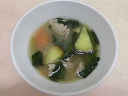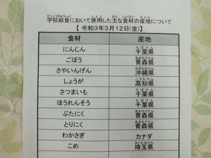 水曜日から1週間は、5年生が家庭科で考えたみそ汁を給食に取り入れた「5年生オリジナルみそ汁週間」です。3日目の今日は、5年1組のオリジナルみそ汁です。みそは、麦みそを、実は豚肉、さつまいも、人参、ほうれん草を使っています。