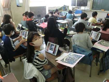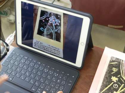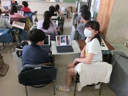 図工で取り組んだ「ほると出てくる不思議な花」の作品の鑑賞を行いました。タブレット端末を使って、子どもたちの作品を鑑賞しました。