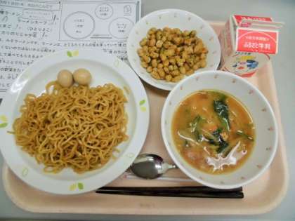今日は、味噌ラーメン、牛乳、煮たまご、カリカリのりじゃが豆です。