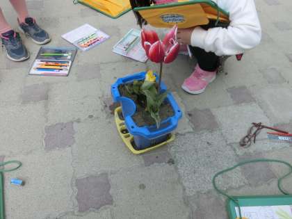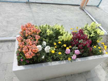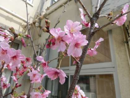 陽光(桜)、チューリップ、地域の方が植えていただいたお花がきれいに咲いています。