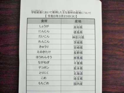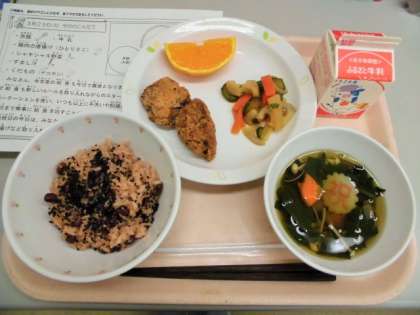 今日は、赤飯、牛乳、鶏肉のから揚げ、シャキシャキ野菜、お祝いすまし汁、デコポン(不知火)です。給食最終日の今日は、修了・卒業お祝い献立です。
