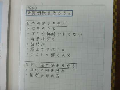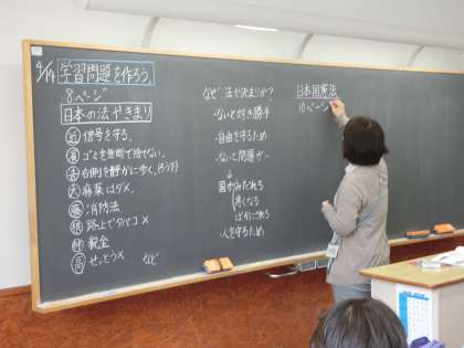 6年生の社会の学習では「法やきまり」について学習問題を作っていました。学習問題とはこの単元で学ぶ見通しをもつ学習です。一般的には、単元のはじめにします。子どもたちと学習問題をつくり、学習の見通しをもって調べていきます。日本の歴史はもう少し先です。