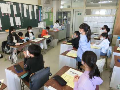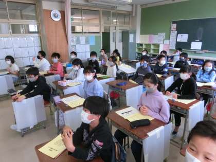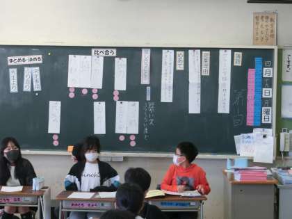 5年生の学級活動では「クラスの目標を決めよう」という議題で話し合いを進めました。自分のクラスの目標を決めるのですからみんな真剣です。挑戦や全力、努力、行動力、協力など、様々な意見が出ました。いい話し合いでした。