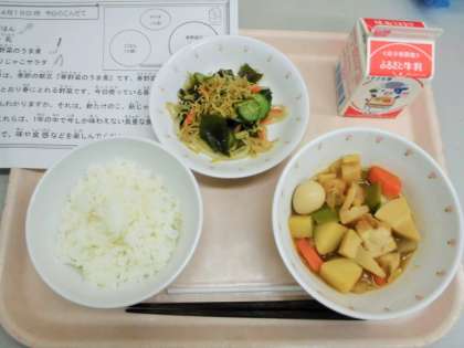 今日は、ごはん、牛乳、春野菜のうま煮、カリじゃこサラダです。