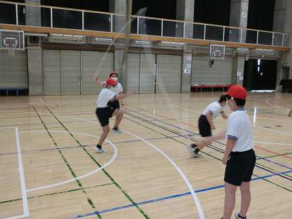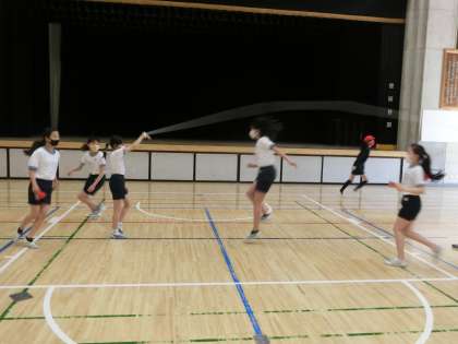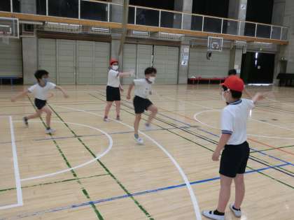 5年生の体育で大繩に挑戦しました。2つのグループに分かれて練習をしました。大繩は縄に入るタイミング、跳び方など、経験がものをいいます。最後に数を数えました。「ドンマイ」、「いいぞ!」なども声も聞こえました。体育の大繩の学習はクラス作りにも生かされます。