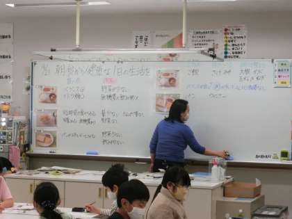 6年生家庭科では「朝食から健康な1日の生活を!」という学習に取り組みました。3日間の朝食を提示し栄養面を中心に足りない栄養素や加えたほうがいい食べ物などを考えて、話し合っていました。6年生の学習意欲の高まりを感じました。
