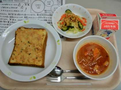 今日は、ツナポテトトースト、牛乳、ごぼうチップサラダ、トマトとエリンギのスープです。
