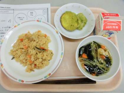 今日は、中華おこわ、牛乳、煎茶揚げ、わかめスープです。