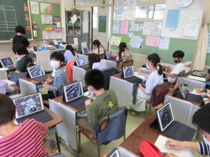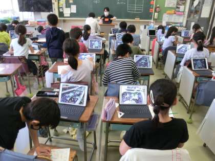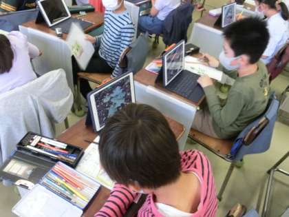 4年生の理科ではヘチマの観察をしました。見ての通りタブレット端末で撮影したヘチマをスケッチしました。もちろん、実物もしっかり観察しています。タブレットを使うよさは撮影した映像を拡大して葉っぱや茎を詳しく観察できるところです。実物を見るのも大切ですが、便利なタブレットのよさを学習に取り入れていきます。