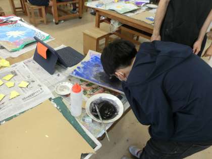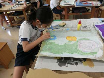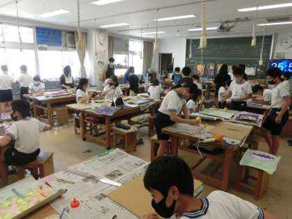 6年生の図工では「花」〜いろどり、いろいろ〜という学習に励んでいます。子どもたちは、想像を広げて、自分だけの花を一生懸命に描いています。段ボールで額も作っています。花と額のバランスを考えて工夫してし作っていました。自分だけの花、きれいに咲いていました。