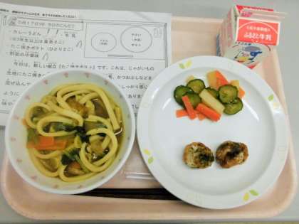 今日は、カレーうどん、牛乳、たこ焼きポテト、野菜の中華味です。