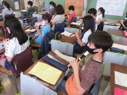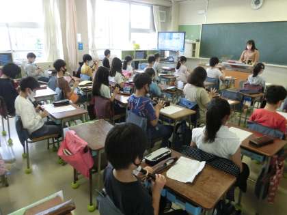 5年生の音楽ではリコーダーの練習に取り組みました。マスクの上からになりますが、工夫しながら授業を進めています。