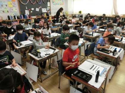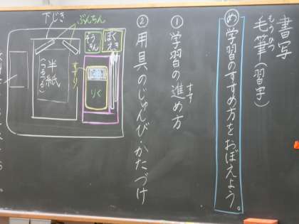3年生から始まった毛筆では、子どもたちは一つ一つ学習の仕方を学んでいます。準備や片付け、学習した後の筆の処理も学びます。今日の学習のめあてが「学習の進め方を覚えよう」でした。子どもたちは学習の仕方や用具の準備、片付けの仕方(筆やすずり)をしっかり学びました。何でも最初が肝心です。頑張りました!