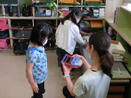 1年生の体力テスト、握力の様子です。やり方もわからない1年生。担任の先生と支援の先生とでテストを行いました。