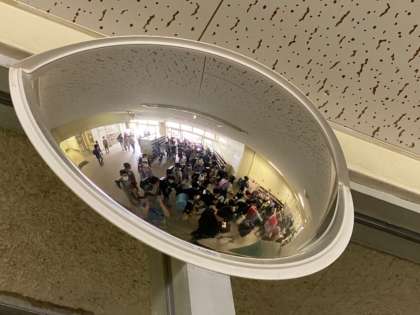 当たり前な小学校の様子を特別に感じてもらえるように、撮り方の様々な工夫をしています。こちらは登校の一場面。鏡越しの風景を撮ってみました。ワンショットワンショット、積み重ねていきます。