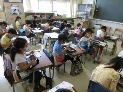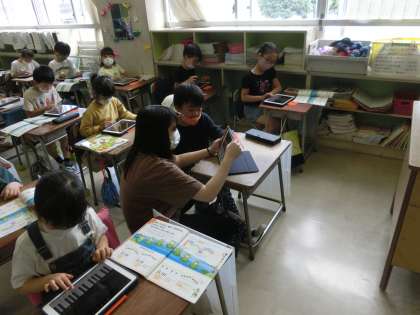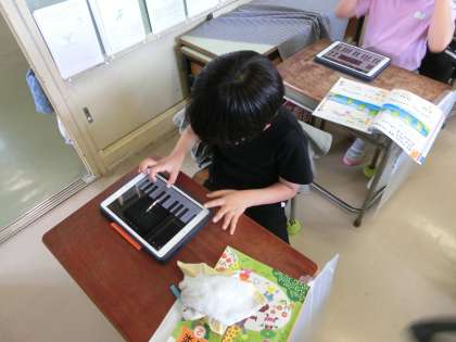 2年生の音楽では「かえるのがっしょう」の学習をしました。鍵盤ハーモニカで演奏しますが、今は感染症対策できません。しかし、タブレットパソコンに演奏ソフトがあります。今日は、タブレットパソコンを鍵盤ハーモニカに見立てて演奏の練習をしました。上手に演奏することができました。