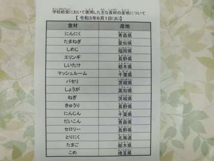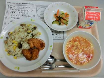 今日は、ベーコンときのこのピラフ、牛乳、サテアヤム、ピクルス、トマトと卵のスープです。