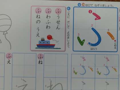 1年生の国語ではひらがなの練習をしました。今日のひらがなは「ふ」です。「ふ」難しい字です。姿勢よく丁寧に書くことがとても大切です。