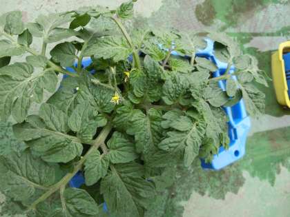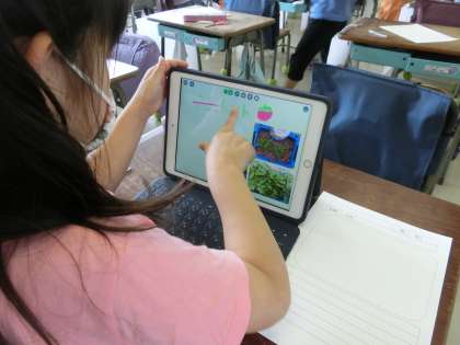 2年生が育てているミニトマトを観察しました。よく見ると黄色い花が見られました。子どもたちは、葉っぱの大きさや形、花の色などに着目して観察ができました。