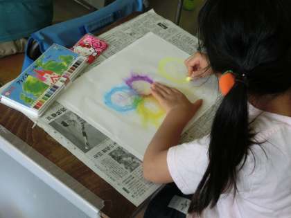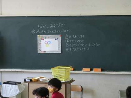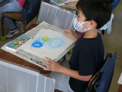 2年生の図工では「ぼかし」方を工夫して絵を描いています。ぼかしによって優しい表現になります。子どもたちは、想像力を働かせて描くことができました。