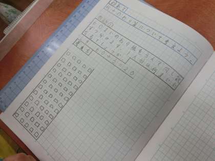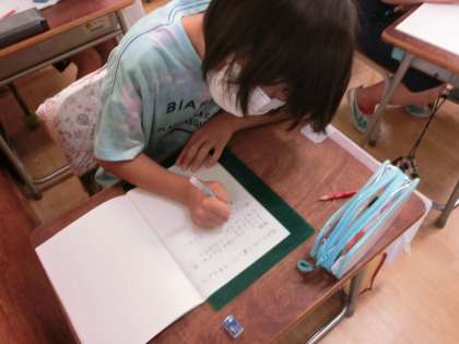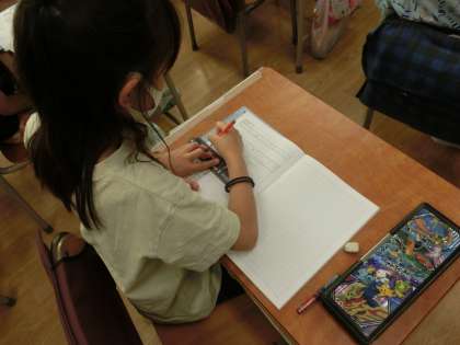 3年生の算数ではわり算に取り組んでいます。「60枚の折り紙を3人で同じ数ずつ分けます。1人分は何枚になるでしょう」という問題でした。子どもたちは小さな折り紙を描いたり、図を描いたりして答えを求めました。また、参観していてノートの取り方が丁寧な仲間が多いことに驚きました。担任の先生の指導と子どもたちの学びに向かう姿勢があって成り立つことです。タブレット端末が導入されていますが、自分の手で字を書くことなど、ノート指導も適切に指導していきます。