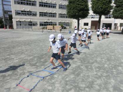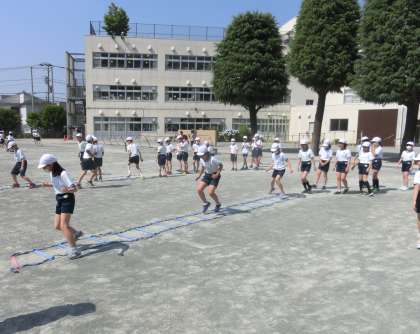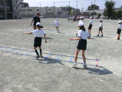 4年生の体育では「Tボール」に取り組んでいます。Tボールの前にラダーを使った運動を行いました。小刻みにリズムよく走ったり、素早い動作で全力で走ったりと様々な運動をしました。子どもたちも楽しく取り組みました。