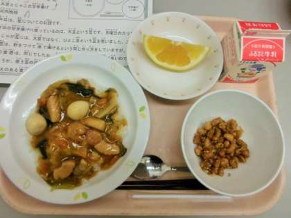 今日は、中華丼、牛乳、大豆とじゃこの甘辛揚げ、河内晩柑です。