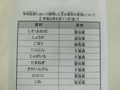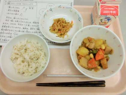 今日は、うめしそごはん、牛乳、豆入り筑前煮、はりはり漬けです。