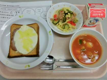 今日は、クロックムッシュ、牛乳、ツナとマカロニのサラダ、ズッキーニ入りトマトスープです。