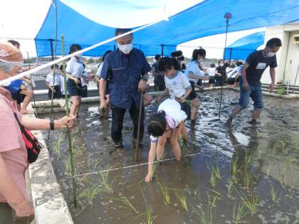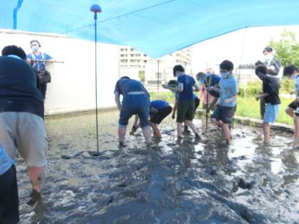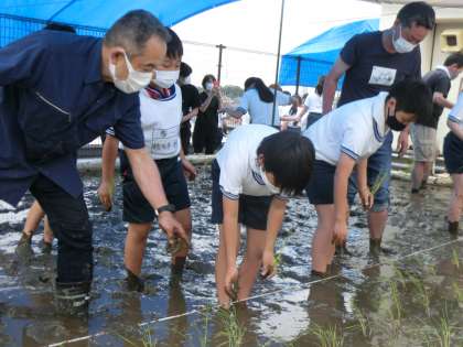 今日、学校支援コーディネータ、学校運営委員会、地域の郷土歴史研究会の皆様のご協力で、田植えを行いました。5年生が総合的な学習の時間でこれから育てていきます。収穫・脱穀体験と地域の方々の協力をいただいて学習を進めていきます。大切に育ててください。