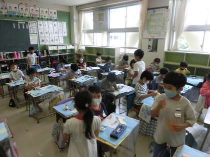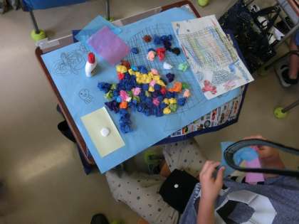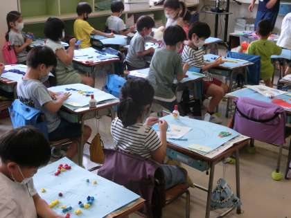 1年生の図工では花紙(ティッシュ)を丸めて形を作って、魚を表現しました。色も魚の種類も個性的です。一人一人自分の思い描いた魚を作っていました。