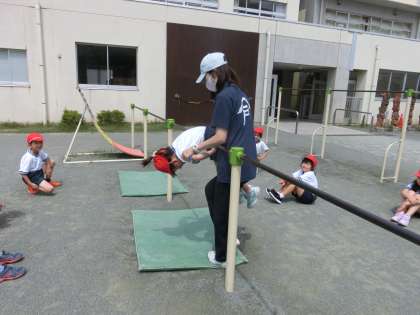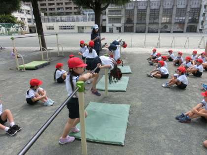 1年生の体育では鉄棒を使って学びました。1年生の体育は「基礎・基本」を学びます。鉄棒に乗ったり(つばめ)、回ったりします。つばめもできない子どもたちもいます。何度も何度も取り組んで、経験してできるようになります。1年生、頑張りました。