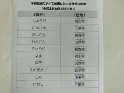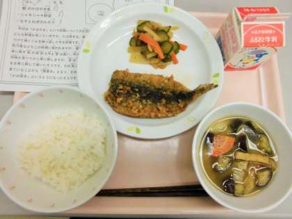 今日は、ごはん、牛乳、いわしのかば焼き風、シャキシャキ野菜、なすとねぎのみそ汁です。