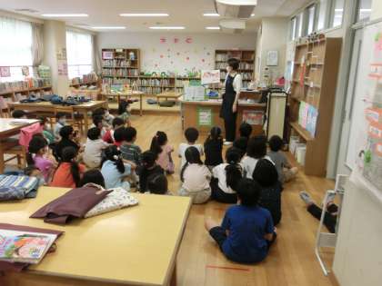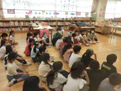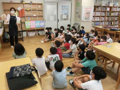 緊急事態宣言発令中は控えていた図書室の利用ですが、宣言解除に伴って図書の時間が再開されました。司書の先生の読み聞かせと本の貸し出しをしました。感染対策を徹底しながらも、徐々に通常の教育活動に戻していきます。