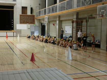 1年生の水泳学習が始まる前に、着替えの場所の確認、プールサイドでの並び方について体育館で学習しました。プールには入っていません。1年生は何から何まで1からですが、安全に水泳学習するためには事前の学習は必要です。1年生はしっかり水泳学習の流れを覚えました。
