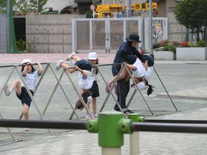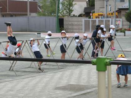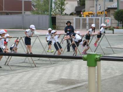 1年生の体育「鉄棒」の様子です。元気に学習の基礎を学んでいます。鉄棒も安全に気を付けて学習しています。