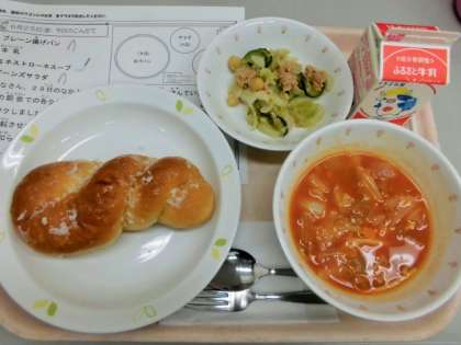 今日は、あげパン、牛乳、ミネストローネ、ビーンズサラダです。