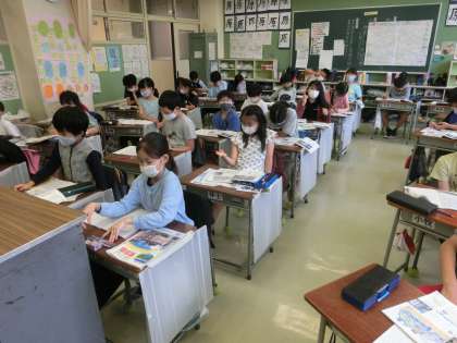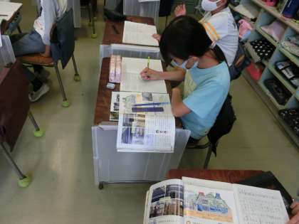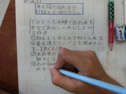 4年生の社会では「浄水場の働き」について学習しています。どのようにして川の水が安全でおいしい水になるのかを調べました。(1) 取水場から水を取り入れる(2)薬を混ぜて濁りを沈める(3)水の中のにおいを分解する(4)石や砂の層に水を通して、水をろ過する。(5)薬品で消毒をして安全な水にしている など、子どもたちは丁寧にノートにまとめました。ノートがとても丁寧な児童が多く感心しました。