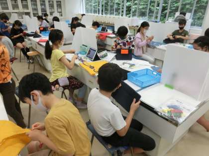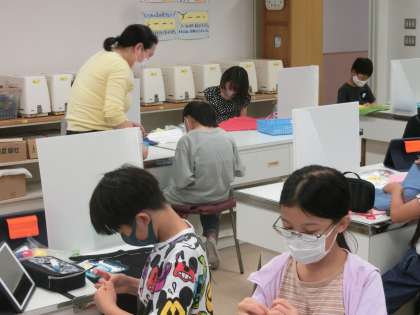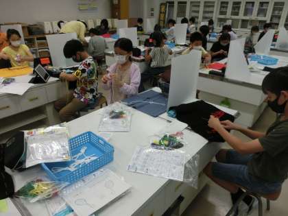 5年生の家庭科では「一針に心をこめて」という学習に取り組んでいます。今までの学習経験を生かしてウオールポケット作りに取り組んでいます。事前に刺繍のデザインを考えて作業をしています。一人一人真剣に取り組み、一針に心を込めています。