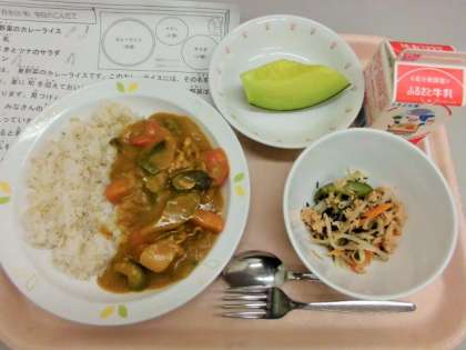 今日は、夏野菜カレーライス、牛乳、ひじきとツナのサラダ、メロンです。