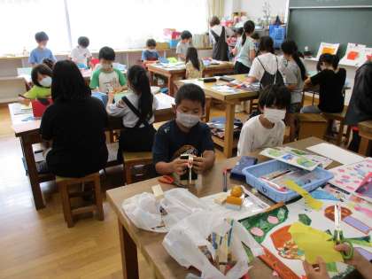 4年生の図工では、1学期のまとめを行いました。絵の具の冒険、作品カード、トントンつないで等、学習してきました。今日は、すべての作品で終わっていないところを作業し完成させました。4年生頑張りました!