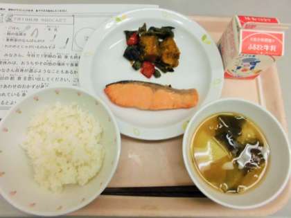 今日は、ごはん、牛乳、魚(鮭)の塩焼き、夏野菜の南蛮かけ、わかめとじゃがいものみそ汁です。