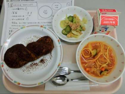 今日は、ココア揚げパン、牛乳、ビーンズサラダ、ミネストローネです。
